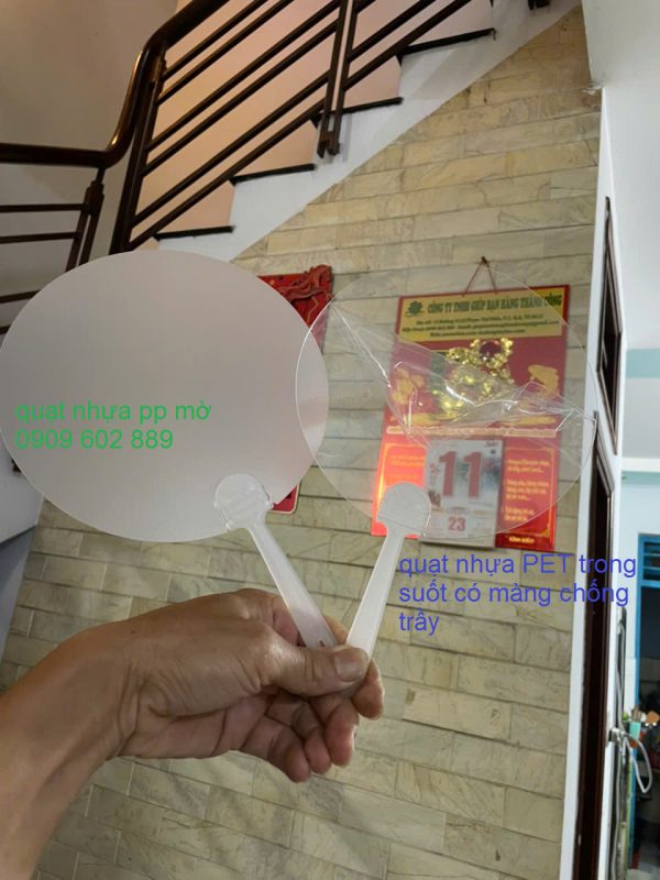 Quạt nhựa PP là một loại quạt nhựa cầm tay, được sản xuất từ nhựa PP cao cấp – một loại nhựa được sử dụng để In offset UV và thân thiện môi trường. Quạt nhựa có 2 phần, Lá quạt và cán quạt. Quạt nhựa quảng cáo đang được rất nhiều nhãn hàng, thương hiệu lựa chọn sử dụng hiện nay, nhờ độ bền (không bị ướt, khó bị rách) và tính thẩm mỹ cao, phù hợp cho nhiều mục đích sử dụng khác nhau. Lá quạt có độ dày từ 0.5mm đến 0.8mm, được in offset UV, kích thước phổ biến 18×18 cm. Gắn cán quạt ngắn (cao 12 cm) hoặc cán quạt dài (cao 17 cm) được ép khuôn từ nhựa PP nguyên sinh.
